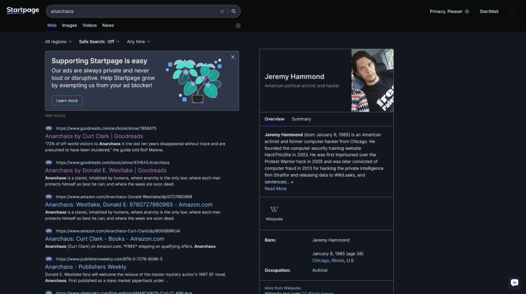 My first thought was that maybe Google (which Startpage piggybacks on) was suppressing search results for Jeremy Hammond or anarchy in general… except I have an interest in anarchist theory and tech news, and I’ve never seen this before. So no.