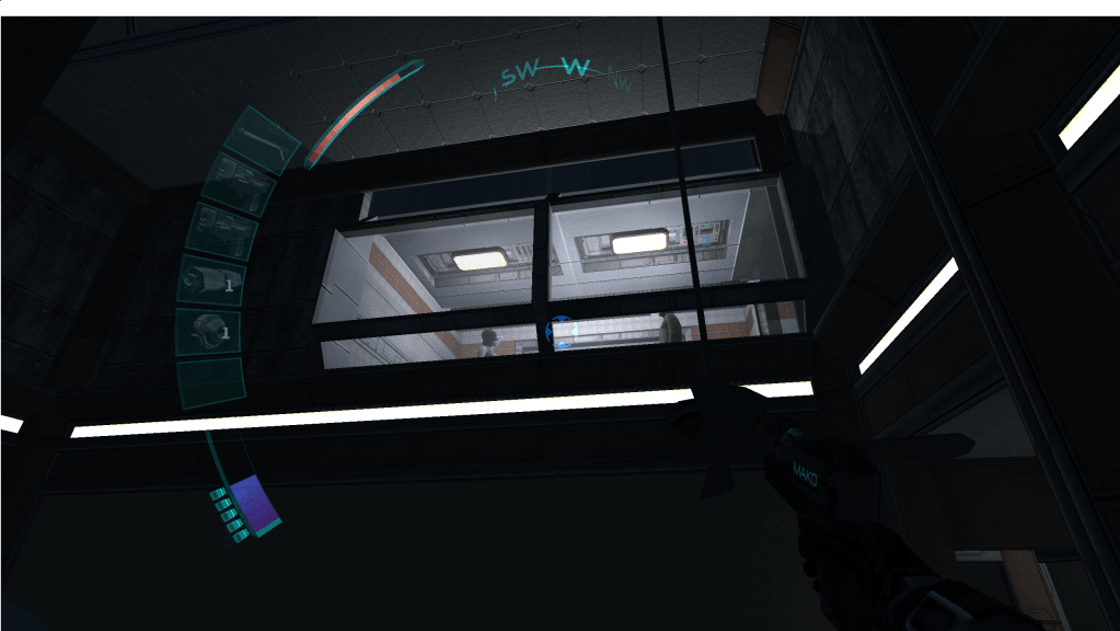 Tarsus Academy is mostly a long hallway with a couple of side rooms, a bit of backtracking, and multiple loading screens. (Thank fuck I’d switched to windowed mode.) For at least the first half of the level, there are no obstacles with more than one way to get past. And the devs felt the need to give me a tutorial for the compass.