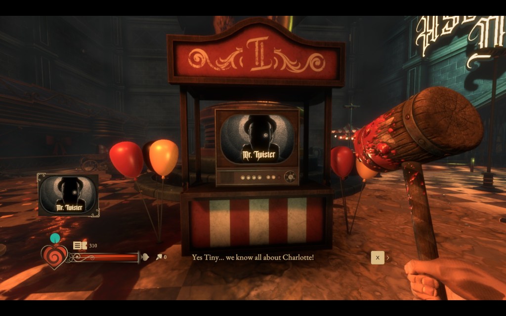 American McGee’s Alice also got namechecked in that video, probably also for its ambience rather than its protagonist characterization, because Tiny seems tonally all over the place. As I approached the entrance, he said, “What the hell is this place?” Tone: understandably worried. Two seconds later, picking up a gore-spattered mallet: “This should come in handy.” Tone: pleased and cheerful. And after using said mallet on the first enemy, a human-sized knife-wielding teddy bear: “Ugh, what was that guy’s problem?”