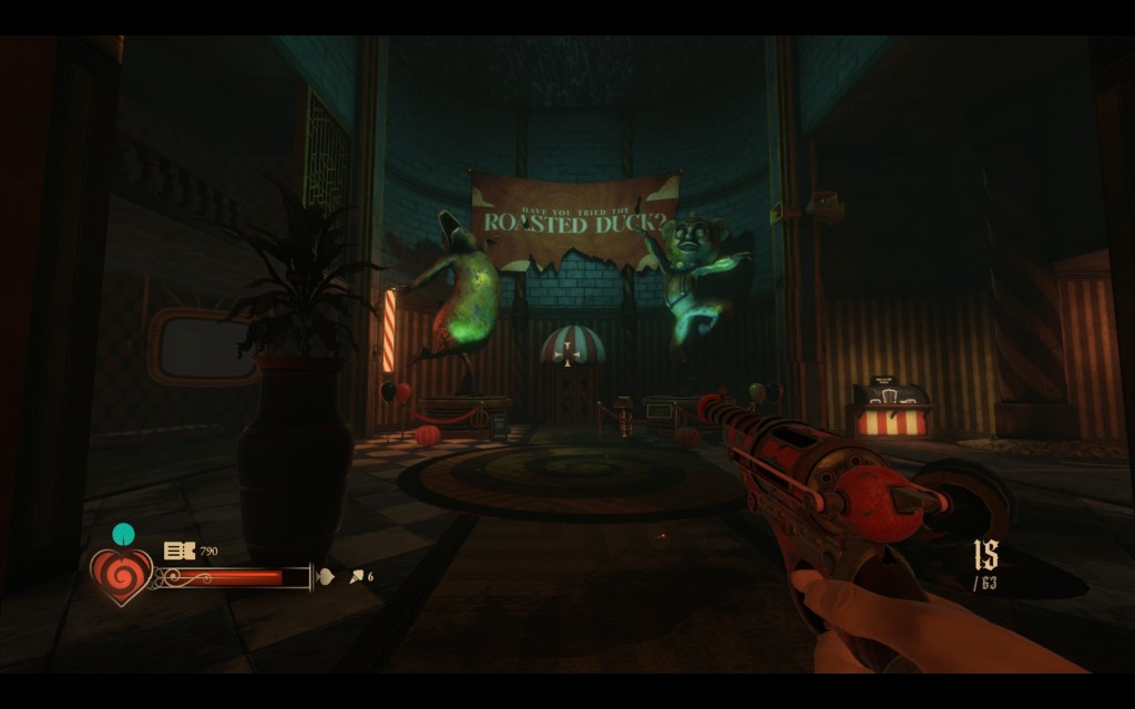 While it was fun double-tapping ax-crazy plushies with a revolver or winding up to brain something with the mallet, it was less fun when I was taking aim and three of those ankle-height toy telephones bum-rushed me from behind. I only got past one of these arenas by retreating to a balcony section which bugged out most of the enemies’ pathfinding, so they stopped trying to swarm me.